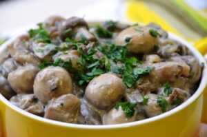 Pot să vă asigur că această reţetă va plăcea tuturor şi nici nu veţi realiza că nu conţine nici un derivat din lapte! Este ideală ca garnitură sau pur şi simplu lângă un pireu din conopidă sau cu nişte spaghete din dovlecel pentru zilele de post. Eu am combinat două feluri de ciuperci pentru simpla noastră plăcere a gustului dar voi puteţi folosi orice fel de ciuperci preferaţi. Am folosit: 500 grame ciuperci Pleurotus tăiate felii 250 grame ciuperci Champignon întregi, pitice 1/3 cană cremă de cocos 1 ceapă albă 2 linguri ulei de cocos 2/3