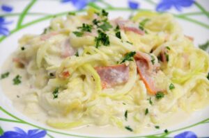 Aceasta este una dintre reţetele noastre preferate pentru cină şi se prepară extrem de uşor şi rapid. Dacă doriţi să aflaţi cum puteţi face spaghetele din dovlecel puteţi să citiţi aici. Pentru sosul carbonara aveţi nevoie de următoarele: Câteva felii de bacon, tăiate mărunt O ceapă albă, tăiată mărunt 2-3 căţei de usturoi, tăiaţi mărunt ½ cană smântână de caju ¼ cană drojdie inactivă Sare şi piper după gust Se căleşte ceapa până devine sticloasă şi apoi se adaugă baconul şi usturoiul. Se gătesc împreună încă vreo 5 minute după care se