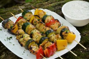 Este momentul ideal să ne bucurăm de soare şi de vară aşa că ieşirile în aer liber sunt obligatorii pentru noi. Când le mai combinăm cu voie bună şi cu prieteni dragi atunci musai să încingem şi un grătar ca să putem profita de o zi întreagă. Mă gândeam la savorile Mediteranei, de care îmi este un dor nebun zilele acestea şi uite aşa mi-a venit poftă de frigărui. Sincer le prefer vegetariene dar am pregătit pentru copii o variantă echilibrată şi uşor de digerat, cu un sos răcoritor, fără să mai port grija temperaturilor ridicate pentru că, bineînţeles, sosul nu conţine deloc lactate, iar frigăruile sunt gătite proaspăt. 🙂 Sper să vă placă şi vouă şi să vă aducă puţină savoare zilelor de vară. Ingrediente Pentru frigărui: 2 piepţi de pui tăiaţi cuburi mari 1 ardei roşu mare, tăiat bucăţi 1 ardei mare galben tăiat bucăţi 3 zucchinni tăiaţi felii mai groase 1 ceapă mare tăiată cuburi Pentru marinată: 3 linguri de zeamă de lămâie 1 lingură de oţet de mere 4 linguri de ulei de măsline 1 lingură de oregano uscat 1 lingură de busuioc proaspăt 1/2